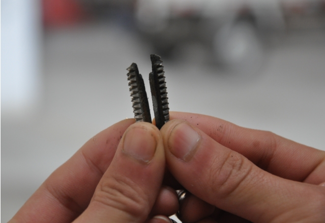 用合適工具夾出打成兩半的斷絲錐,工件螺紋